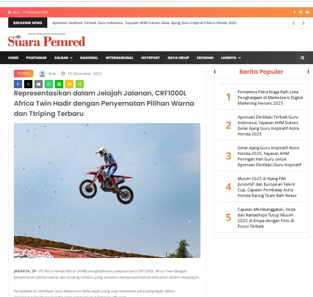 Representasikan dalam Jelajah Jalanan, CRF1000L Africa Twin Hadir dengan Penyematan Pilihan Warna dan Ttriping Terbaru by masmul 10 Desember 2025 in Silahkan kunjungi https://www.suarapemredkalbar.com/read/potret/10122025/representasikan-dalam-jelajah-jalanan-crf1000l-africa-twin-hadir-dengan-penyematan-pilihan-warna-dan-ttriping-terbaru. You Might Like Regional Public Launching New ADV160 The SUV Pride Grand Launching New PCX 160 Truly Exceptional! Tetap hati-hati ya bro sist berkendara saat hujan.