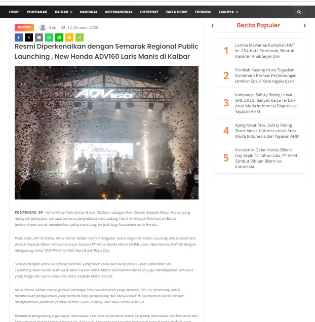Resmi Diperkenalkan dengan Semarak Regional Public Launching , New Honda ADV160 Laris Manis di Kalbar by masmul 12 Oktober 2025 in Silahkan kunjungi https://www.suarapemredkalbar.com/read/potret/12102025/resmi-diperkenalkan-dengan-semarak-regional-public-launching-new-honda-adv160-laris-manis-di-kalbar. You Might Like Regional Public Launching New ADV160 The SUV Pride Grand Launching New PCX 160 Truly Exceptional! Tetap hati-hati ya bro sist berkendara saat hujan.