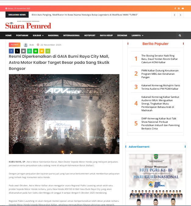 Resmi Diperkenalkan di GAIA Bumi Raya City Mall, Astra Motor Kalbar Target Besar pada Sang Skutik Bongsor by masmul 22 November 2025 in Silahkan kunjungi https://www.suarapemredkalbar.com/read/potret/22112025/resmi-diperkenalkan-di-gaia-bumi-raya-city-mall-astra-motor-kalbar-target-besar-pada-sang-skutik-bongsor. You Might Like Regional Public Launching New ADV160 The SUV Pride Grand Launching New PCX 160 Truly Exceptional! Tetap hati-hati ya bro sist berkendara saat hujan.