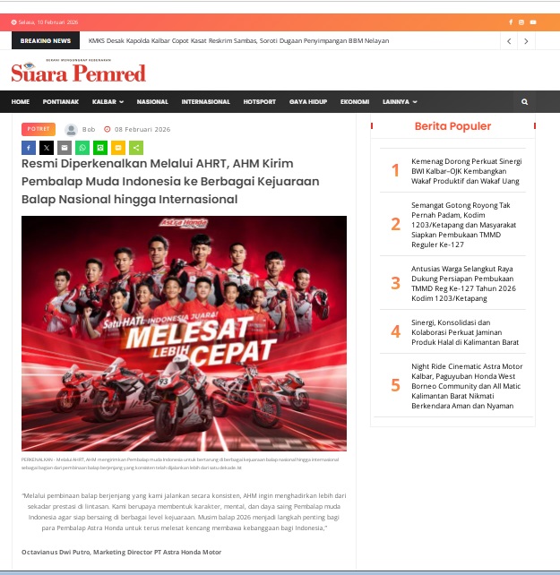 Resmi Diperkenalkan Melalui AHRT, AHM Kirim Pembalap Muda Indonesia ke Berbagai Kejuaraan Balap Nasional hingga Internasional by masmul 8 Februari 2026 in Silahkan kunjungi https://www.suarapemredkalbar.com/read/potret/08022026/resmi-diperkenalkan-melalui-ahrt-ahm-kirim-pembalap-muda-indonesia-ke-berbagai-kejuaraan-balap-nasional-hingga-internasional. You Might Like Regional Public Launching New ADV160 The SUV Pride Grand Launching New PCX 160 Truly Exceptional! Tetap hati-hati ya bro sist berkendara saat hujan.