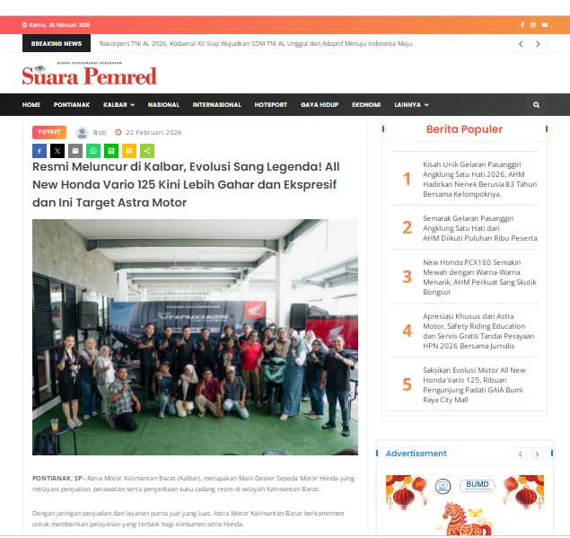 Resmi Meluncur di Kalbar, Evolusi Sang Legenda! All New Honda Vario 125 Kini Lebih Gahar dan Ekspresif dan Ini Target Astra Motor by masmul 22 Februari 2026 in Silahkan kunjungi https://www.suarapemredkalbar.com/read/potret/22022026/resmi-meluncur-di-kalbar-evolusi-sang-legenda-all-new-honda-vario-125-kini-lebih-gahar-dan-ekspresif-dan-ini-target-astra-motor. You Might Like Regional Public Launching New ADV160 The SUV Pride Grand Launching New PCX 160 Truly Exceptional! Tetap hati-hati ya bro sist berkendara saat hujan.