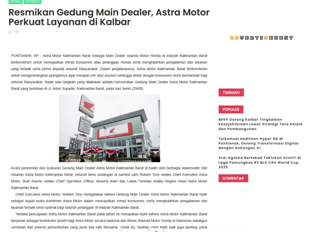 Resmikan Gedung Main Dealer, Astra Motor Perkuat Layanan di Kalbar by Muhammad Arif 3 Oktober 2025 in Silahkan kunjungi https://www.kapuaspost.web.id/2025/10/resmikan-gedung-main-dealer-astra-motor.html. Tags: astra Astra Motor kalbar Astra Motor Pontianak astramotor honda kalbar pontianak sepeda motor You Might Like Regional Public Launching New ADV160 The SUV Pride Grand Launching New PCX 160 Truly Exceptional! Tetap hati-hati ya bro sist berkendara saat hujan.