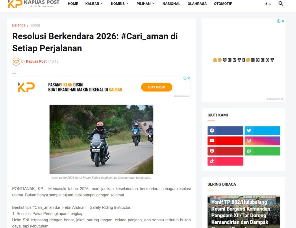 Resolusi Berkendara 2026: #Cari_aman di Setiap Perjalanan by Muhammad Arif 24 Januari 2026 in Silahkan kunjungi https://www.kapuaspost.web.id/2026/01/resolusi-berkendara-2026-cariaman-di.html. Tags: astra Astra Motor kalbar Astra Motor Pontianak astramotor honda kalbar pontianak sepeda motor You Might Like Regional Public Launching New ADV160 The SUV Pride Grand Launching New PCX 160 Truly Exceptional! Tetap hati-hati ya bro sist berkendara saat hujan.