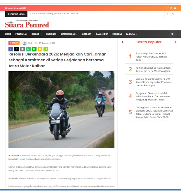 Resolusi Berkendara 2026: Menjadikan Cari_aman sebagai Komitmen di Setiap Perjalanan bersama Astra Motor Kalbar by masmul 25 Januari 2026 in Silahkan kunjungi https://www.suarapemredkalbar.com/read/potret/25012026/resolusi-berkendara-2026-menjadikan-cari_aman-sebagai-komitmen-di-setiap-perjalanan-bersama-astra-motor-kalbar. You Might Like Regional Public Launching New ADV160 The SUV Pride Grand Launching New PCX 160 Truly Exceptional! Tetap hati-hati ya bro sist berkendara saat hujan.