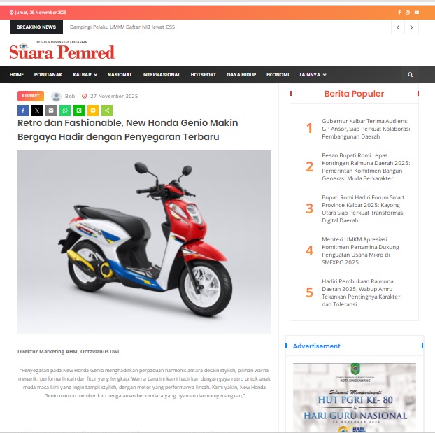 Retro dan Fashionable, New Honda Genio Makin Bergaya Hadir dengan Penyegaran Terbaru by masmul 28 November 2025 in Silahkan kunjungi https://www.suarapemredkalbar.com/read/potret/27112025/retro-dan-fashionable-new-honda-genio-makin-bergaya-hadir-dengan-penyegaran-terbaru. You Might Like Regional Public Launching New ADV160 The SUV Pride Grand Launching New PCX 160 Truly Exceptional! Tetap hati-hati ya bro sist berkendara saat hujan.