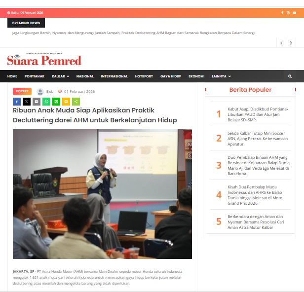 Ribuan Anak Muda Siap Aplikasikan Praktik Decluttering darei AHM untuk Berkelanjutan Hidup by masmul 1 Februari 2026 in Silahkan kunjungi https://www.suarapemredkalbar.com/read/potret/01022026/ribuan-anak-muda-siap-aplikasikan-praktik-decluttering-darei-ahm-untuk-berkelanjutan-hidup. You Might Like Regional Public Launching New ADV160 The SUV Pride Grand Launching New PCX 160 Truly Exceptional! Tetap hati-hati ya bro sist berkendara saat hujan.