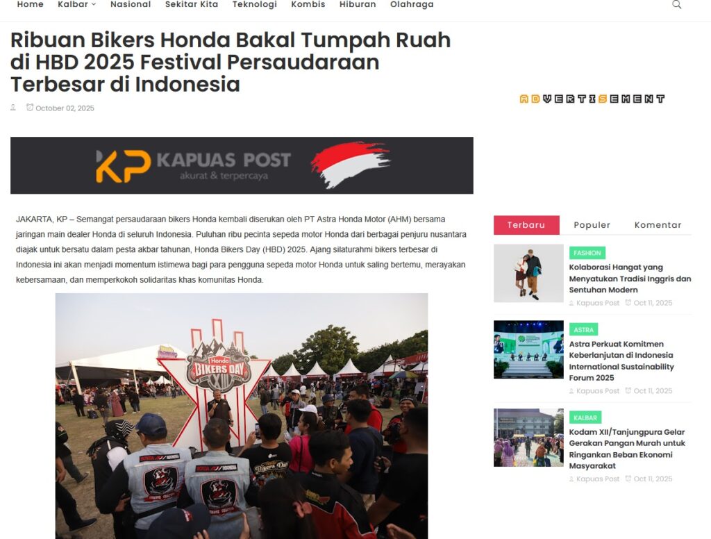 Ribuan Bikers Honda Bakal Tumpah Ruah di HBD 2025 Festival Persaudaraan Terbesar di Indonesia by Muhammad Arif 2 Oktober 2025 in Silahkan kunjungi https://www.kapuaspost.web.id/2025/10/ribuan-bikers-honda-bakal-tumpah-ruah.html. Tags: astra Astra Motor kalbar Astra Motor Pontianak astramotor honda kalbar pontianak sepeda motor You Might Like Regional Public Launching New ADV160 The SUV Pride Grand Launching New PCX 160 Truly Exceptional! Tetap hati-hati ya bro sist berkendara saat hujan.