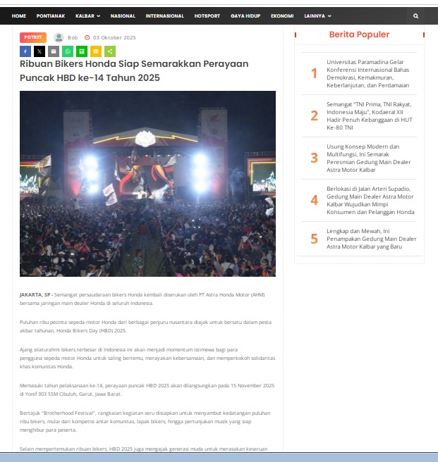 Ribuan Bikers Honda Siap Semarakkan Perayaan Puncak HBD ke-14 Tahun 2025 by masmul 3 Oktober 2025 in Silahkan kunjungi https://www.suarapemredkalbar.com/read/potret/03102025/ribuan-bikers-honda-siap-semarakkan-perayaan-puncak-hbd-ke-14-tahun-2025. You Might Like Regional Public Launching New ADV160 The SUV Pride Grand Launching New PCX 160 Truly Exceptional! Tetap hati-hati ya bro sist berkendara saat hujan.