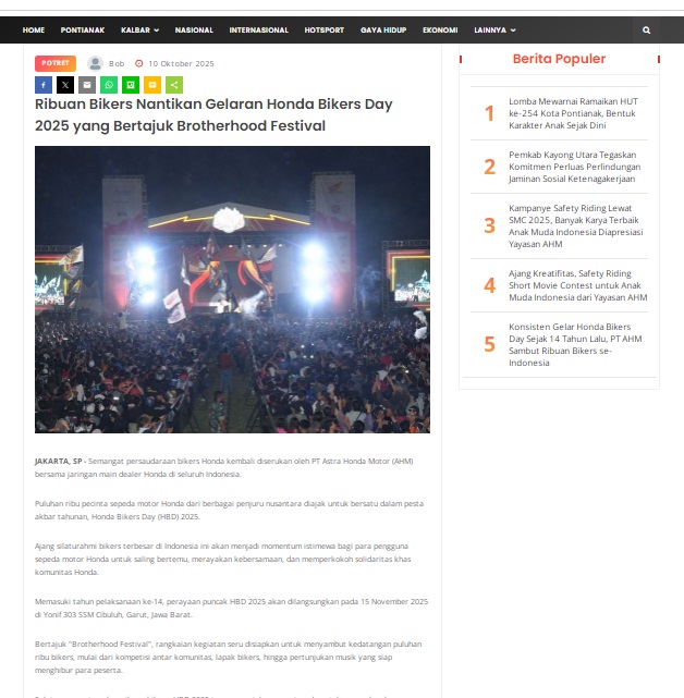 Ribuan Bikers Nantikan Gelaran Honda Bikers Day 2025 yang Bertajuk Brotherhood Festival by masmul 10 Oktober 2025 in Silahkan kunjungi https://www.suarapemredkalbar.com/read/potret/10102025/ribuan-bikers-nantikan-gelaran-honda-bikers-day-2025-yang-bertajuk-brotherhood-festival. You Might Like Regional Public Launching New ADV160 The SUV Pride Grand Launching New PCX 160 Truly Exceptional! Tetap hati-hati ya bro sist berkendara saat hujan.