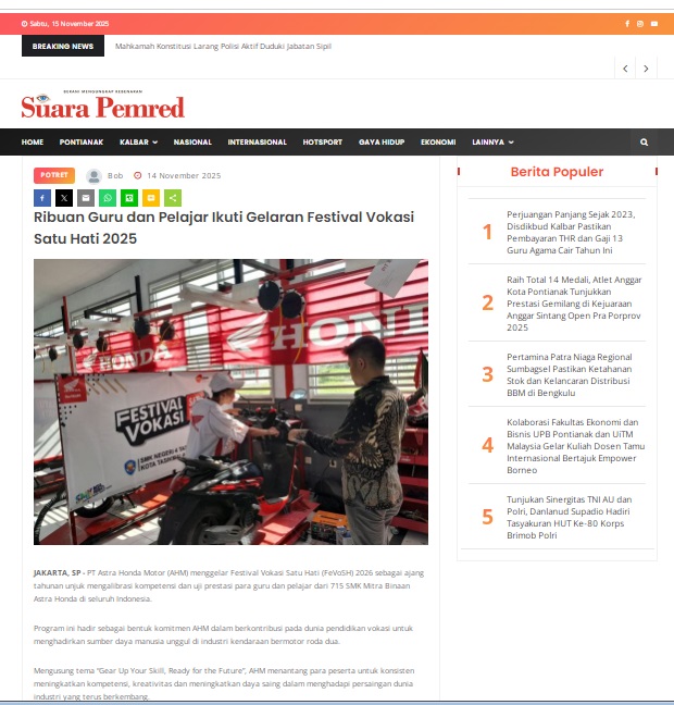 Ribuan Guru dan Pelajar Ikuti Gelaran Festival Vokasi Satu Hati 2025 by masmul 14 November 2025 in Silahkan kunjungi https://www.suarapemredkalbar.com/read/potret/14112025/ribuan-guru-dan-pelajar-ikuti-gelaran-festival-vokasi-satu-hati-2025. You Might Like Regional Public Launching New ADV160 The SUV Pride Grand Launching New PCX 160 Truly Exceptional! Tetap hati-hati ya bro sist berkendara saat hujan.