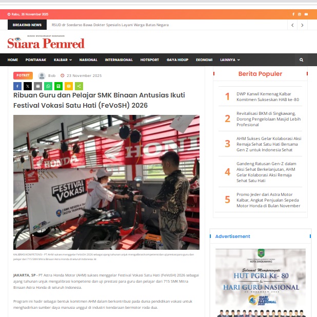 Ribuan Guru dan Pelajar SMK Binaan Antusias Ikuti Festival Vokasi Satu Hati (FeVoSH) 2026 by masmul 23 November 2025 in Silahkan kunjungi https://www.suarapemredkalbar.com/read/potret/23112025/ribuan-guru-dan-pelajar-smk-binaan-antusias-ikuti-festival-vokasi-satu-hati-fevosh-2026. You Might Like Regional Public Launching New ADV160 The SUV Pride Grand Launching New PCX 160 Truly Exceptional! Tetap hati-hati ya bro sist berkendara saat hujan.