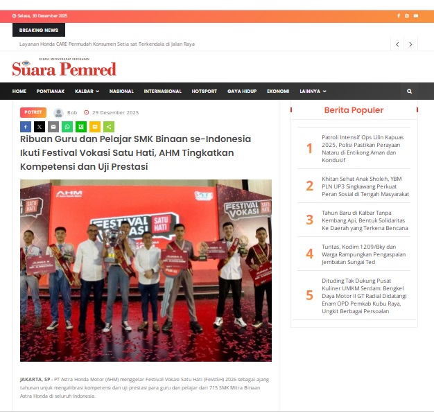Ribuan Guru dan Pelajar SMK Binaan se-Indonesia Ikuti Festival Vokasi Satu Hati, AHM Tingkatkan Kompetensi dan Uji Prestasi by masmul 29 Desember 2025 in Silahkan kunjungi https://www.suarapemredkalbar.com/read/potret/29122025/ribuan-guru-dan-pelajar-smk-binaan-se-indonesia-ikuti-festival-vokasi-satu-hati-ahm-tingkatkan-kompetensi-dan-uji-prestasi. You Might Like Regional Public Launching New ADV160 The SUV Pride Grand Launching New PCX 160 Truly Exceptional! Tetap hati-hati ya bro sist berkendara saat hujan.