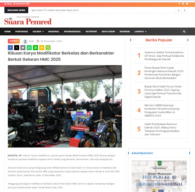 Ribuan Karya Modifikator Berkelas dan Berkarakter Berkat Gelaran HMC 2025 by masmul 28 November 2025 in Silahkan kunjungi https://www.suarapemredkalbar.com/read/potret/28112025/ribuan-karya-modifikator-berkelas-dan-berkarakter-berkat-gelaran-hmc-2025. You Might Like Regional Public Launching New ADV160 The SUV Pride Grand Launching New PCX 160 Truly Exceptional! Tetap hati-hati ya bro sist berkendara saat hujan.