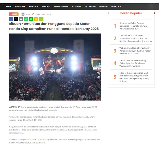 Ribuan Komunitas dan Pengguna Sepeda Motor Honda Siap Ramaikan Puncak Honda Bikers Day 2025 by masmul 26 Oktober 2025 in Silahkan kunjungi https://www.suarapemredkalbar.com/read/potret/26102025/ribuan-komunitas-dan-pengguna-sepeda-motor-honda-siap-ramaikan-puncak-honda-bikers-day-2025. You Might Like Regional Public Launching New ADV160 The SUV Pride Grand Launching New PCX 160 Truly Exceptional! Tetap hati-hati ya bro sist berkendara saat hujan.