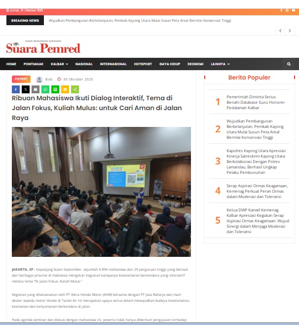 Ribuan Mahasiswa Ikuti Dialog Interaktif, Tema di Jalan Fokus, Kuliah Mulus: untuk Cari Aman di Jalan Raya by masmul 30 Oktober 2025 in Silahkan kunjungi https://www.suarapemredkalbar.com/read/potret/30102025/ribuan-mahasiswa-ikuti-dialog-interaktif-tema-di-jalan-fokus-kuliah-mulus-untuk-cari-aman-di-jalan-raya. You Might Like Regional Public Launching New ADV160 The SUV Pride Grand Launching New PCX 160 Truly Exceptional! Tetap hati-hati ya bro sist berkendara saat hujan.