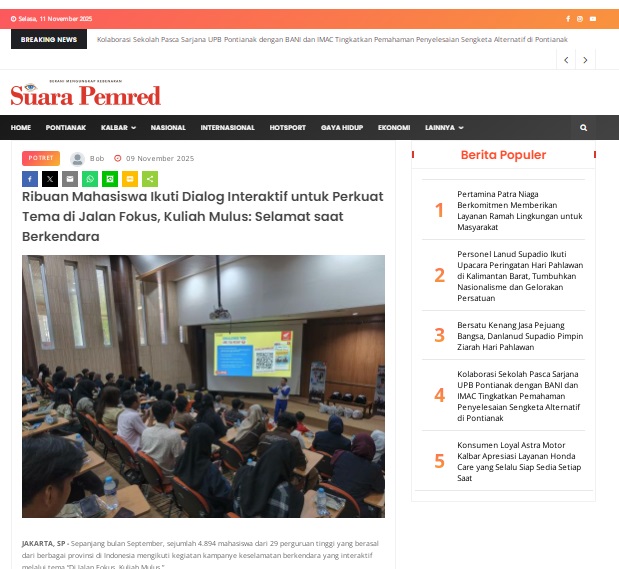 Ribuan Mahasiswa Ikuti Dialog Interaktif untuk Perkuat Tema di Jalan Fokus, Kuliah Mulus: Selamat saat Berkendara by masmul 9 November 2025 in Silahkan kunjungi https://www.suarapemredkalbar.com/read/potret/09112025/ribuan-mahasiswa-ikuti-dialog-interaktif-untuk-perkuat-tema-di-jalan-fokus-kuliah-mulus-selamat-saat-berkendara. You Might Like Regional Public Launching New ADV160 The SUV Pride Grand Launching New PCX 160 Truly Exceptional! Tetap hati-hati ya bro sist berkendara saat hujan.