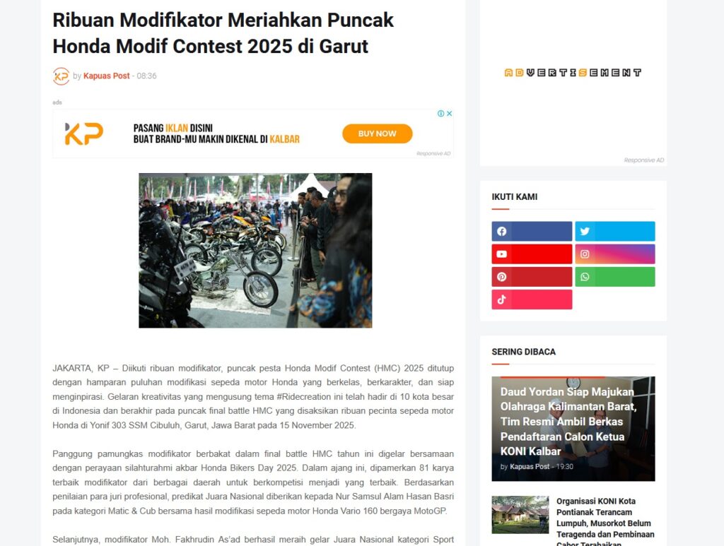 Ribuan Modifikator Meriahkan Puncak Honda Modif Contest 2025 di Garut by Muhammad Arif 3 Desember 2025 in Silahkan kunjungi https://www.kapuaspost.web.id/2025/12/ribuan-modifikator-meriahkan-puncak.html. Tags: astra Astra Motor kalbar Astra Motor Pontianak astramotor honda kalbar pontianak sepeda motor You Might Like Regional Public Launching New ADV160 The SUV Pride Grand Launching New PCX 160 Truly Exceptional! Tetap hati-hati ya bro sist berkendara saat hujan.