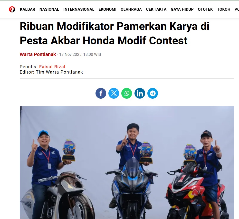Ribuan Modifikator Pamerkan Karya di Pesta Akbar Honda Modif Contest by Faisal Rizal 17 November 2025 in Silahkan kunjungi https://wartapontianak.pikiran-rakyat.com/ototek/pr-1179796678/ribuan-modifikator-pamerkan-karya-di-pesta-akbar-honda-modif-contest. You Might Like Regional Public Launching New ADV160 The SUV Pride Grand Launching New PCX 160 Truly Exceptional! Tetap hati-hati ya bro sist berkendara saat hujan.