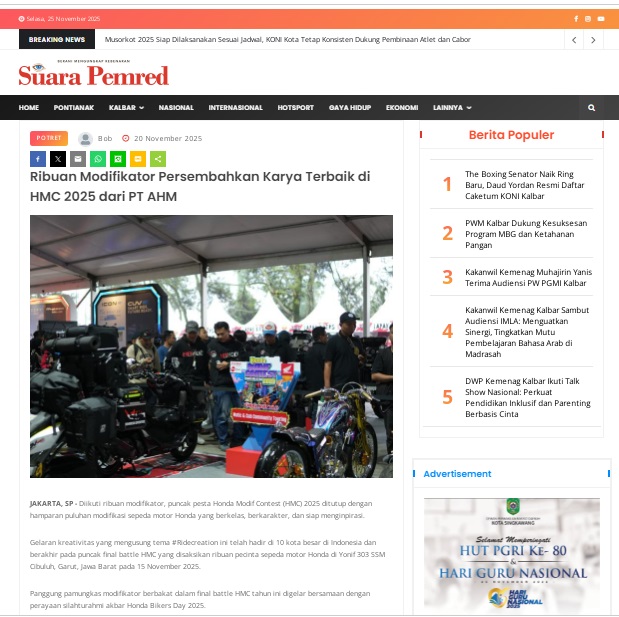 Ribuan Modifikator Persembahkan Karya Terbaik di HMC 2025 dari PT AHM by masmul 20 November 2025 in Silahkan kunjungi https://www.suarapemredkalbar.com/read/potret/20112025/ribuan-modifikator-persembahkan-karya-terbaik-di-hmc-2025-dari-pt-ahm. You Might Like Regional Public Launching New ADV160 The SUV Pride Grand Launching New PCX 160 Truly Exceptional! Tetap hati-hati ya bro sist berkendara saat hujan.