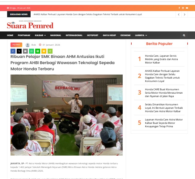 Ribuan Pelajar SMK Binaan AHM Antusias Ikuti Program AHBI Berbagi Wawasan Teknologi Sepeda Motor Honda Terbaru by masmul 1 Januari 2026 in Silahkan kunjungi https://www.suarapemredkalbar.com/read/potret/01012026/ribuan-pelajar-smk-binaan-ahm-antusias-ikuti-program-ahbi-berbagi-wawasan-teknologi-sepeda-motor-honda-terbaru. You Might Like Regional Public Launching New ADV160 The SUV Pride Grand Launching New PCX 160 Truly Exceptional! Tetap hati-hati ya bro sist berkendara saat hujan.