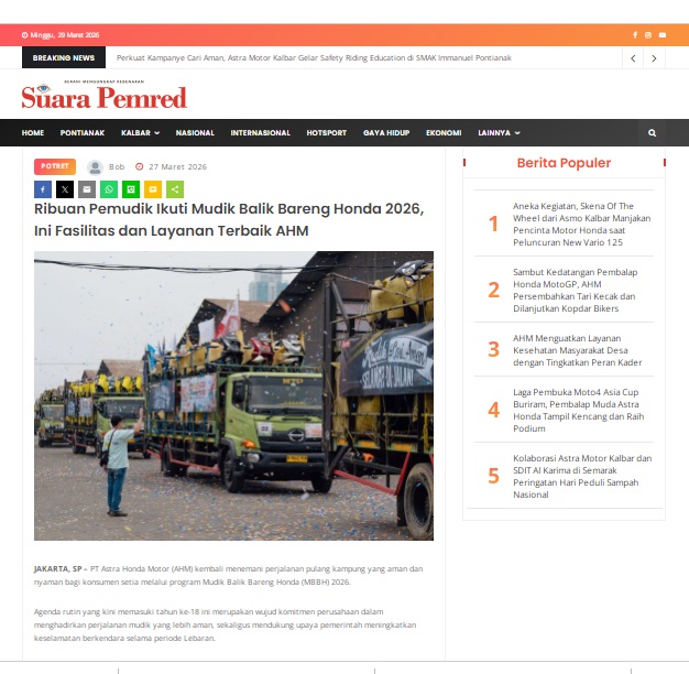Ribuan Pemudik Ikuti Mudik Balik Bareng Honda 2026, Ini Fasilitas dan Layanan Terbaik AHM by masmul 27 Maret 2026 in Silahkan kunjungi https://www.suarapemredkalbar.com/read/potret/27032026/ribuan-pemudik-ikuti-mudik-balik-bareng-honda-2026-ini-fasilitas-dan-layanan-terbaik-ahm. You Might Like Regional Public Launching New ADV160 The SUV Pride Grand Launching New PCX 160 Truly Exceptional! Tetap hati-hati ya bro sist berkendara saat hujan.