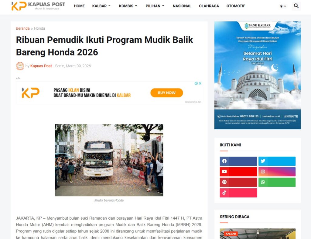 Ribuan Pemudik Ikuti Program Mudik Balik Bareng Honda 2026 by Muhammad Arif 9 Maret 2026 in Silahkan kunjungi https://www.kapuaspost.web.id/2026/03/ribuan-pemudik-ikuti-program-mudik.html. Tags: astra Astra Motor kalbar Astra Motor Pontianak astramotor honda kalbar pontianak sepeda motor You Might Like Regional Public Launching New ADV160 The SUV Pride Grand Launching New PCX 160 Truly Exceptional! Tetap hati-hati ya bro sist berkendara saat hujan.