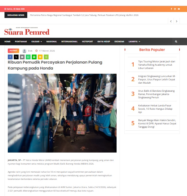 Ribuan Pemudik Percayakan Perjalanan Pulang Kampung pada Honda by masmul 17 Maret 2026 in Silahkan kunjungi https://www.suarapemredkalbar.com/read/potret/17032026/ribuan-pemudik-percayakan-perjalanan-pulang-kampung-pada-honda. You Might Like Regional Public Launching New ADV160 The SUV Pride Grand Launching New PCX 160 Truly Exceptional! Tetap hati-hati ya bro sist berkendara saat hujan.