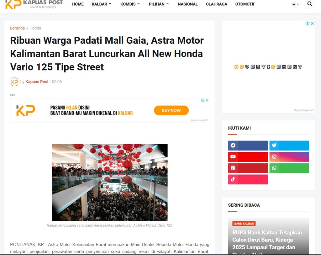 Ribuan Warga Padati Mall Gaia, Astra Motor Kalimantan Barat Luncurkan All New Honda Vario 125 Tipe Street by Muhammad Arif 27 Februari 2026 in Silahkan kunjungi https://www.kapuaspost.web.id/2026/02/ribuan-warga-padati-mall-gaia-astra.html. Tags: astra Astra Motor kalbar Astra Motor Pontianak astramotor honda kalbar pontianak sepeda motor You Might Like Regional Public Launching New ADV160 The SUV Pride Grand Launching New PCX 160 Truly Exceptional! Tetap hati-hati ya bro sist berkendara saat hujan.