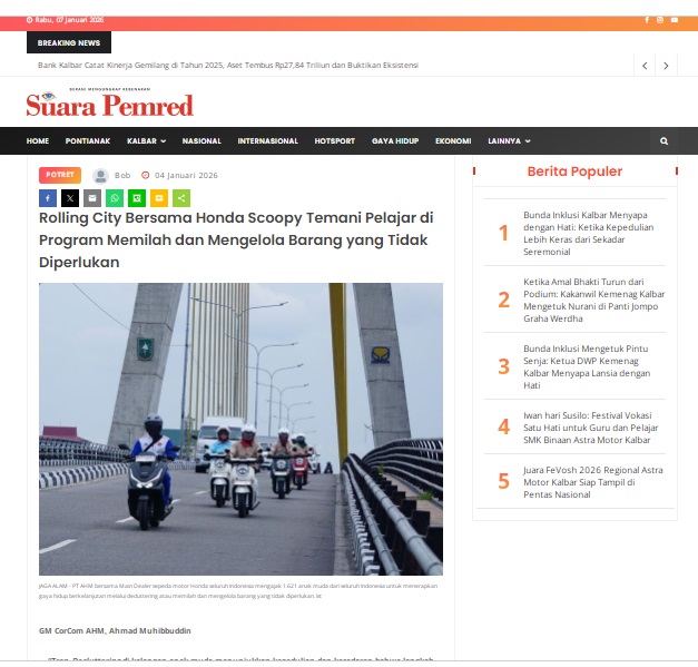 Rolling City Bersama Honda Scoopy Temani Pelajar di Program Memilah dan Mengelola Barang yang Tidak Diperlukan by masmul 4 Januari 2026 in Silahkan kunjungi https://www.suarapemredkalbar.com/read/potret/04012026/rolling-city-bersama-honda-scoopy-temani-pelajar-di-program-memilah-dan-mengelola-barang-yang-tidak-diperlukan. You Might Like Regional Public Launching New ADV160 The SUV Pride Grand Launching New PCX 160 Truly Exceptional! Tetap hati-hati ya bro sist berkendara saat hujan.