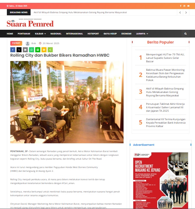 Rolling City dan Bukber Bikers Ramadhan HWBC by masmul 20 Maret 2025 in Silahkan kunjungi https://www.suarapemredkalbar.com/read/potret/20032025/rolling-city-dan-bukber-bikers-ramadhan-hwbc. You Might Like Regional Public Launching New ADV160 The SUV Pride Grand Launching New PCX 160 Truly Exceptional! Tetap hati-hati ya bro sist berkendara saat hujan.