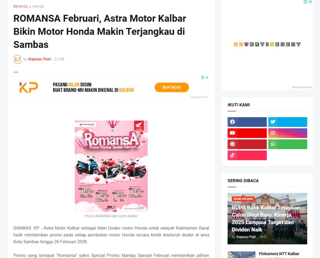 ROMANSA Februari, Astra Motor Kalbar Bikin Motor Honda Makin Terjangkau di Sambas by Muhammad Arif 9 Februari 2026 in Silahkan kunjungi https://www.kapuaspost.web.id/2026/02/romansa-februari-astra-motor-kalbar.html. Tags: astra Astra Motor kalbar Astra Motor Pontianak astramotor honda kalbar pontianak sepeda motor You Might Like Regional Public Launching New ADV160 The SUV Pride Grand Launching New PCX 160 Truly Exceptional! Tetap hati-hati ya bro sist berkendara saat hujan.
