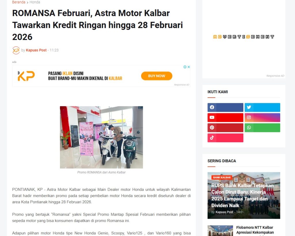 ROMANSA Februari, Astra Motor Kalbar Tawarkan Kredit Ringan hingga 28 Februari 2026 by Muhammad Arif 16 Februari 2026 in Silahkan kunjungi https://www.kapuaspost.web.id/2026/02/romansa-februari-astra-motor-kalbar_22.html. Tags: astra Astra Motor kalbar Astra Motor Pontianak astramotor honda kalbar pontianak sepeda motor You Might Like Regional Public Launching New ADV160 The SUV Pride Grand Launching New PCX 160 Truly Exceptional! Tetap hati-hati ya bro sist berkendara saat hujan.