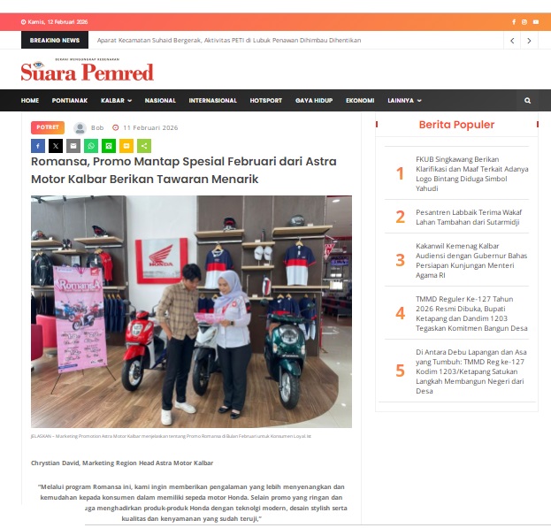 Romansa, Promo Mantap Spesial Februari dari Astra Motor Kalbar Berikan Tawaran Menarik by masmul 11 Februari 2026 in Silahkan kunjungi https://www.suarapemredkalbar.com/read/potret/11022026/romansa-promo-mantap-spesial-februari-dari-astra-motor-kalbar-berikan-tawaran-menarik. You Might Like Regional Public Launching New ADV160 The SUV Pride Grand Launching New PCX 160 Truly Exceptional! Tetap hati-hati ya bro sist berkendara saat hujan.