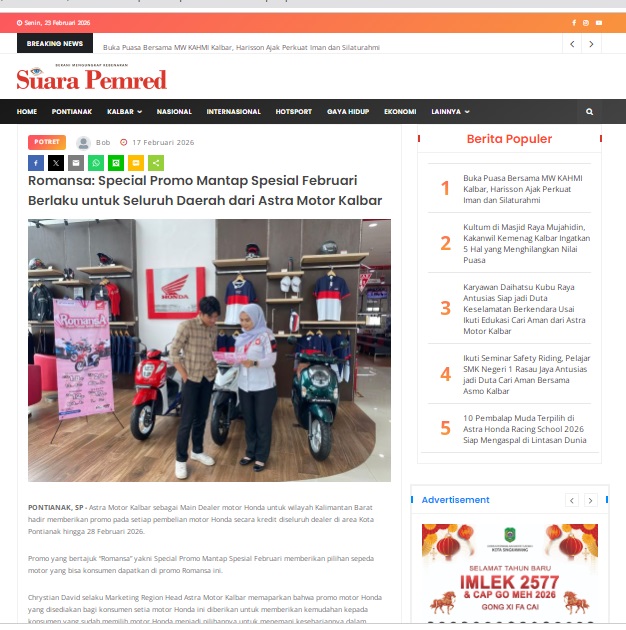 Romansa: Special Promo Mantap Spesial Februari Berlaku untuk Seluruh Daerah dari Astra Motor Kalbar by masmul 17 Februari 2026 in Silahkan kunjungi https://www.suarapemredkalbar.com/read/potret/17022026/romansa-special-promo-mantap-spesial-februari-berlaku-untuk-seluruh-daerah-dari-astra-motor-kalbar. You Might Like Regional Public Launching New ADV160 The SUV Pride Grand Launching New PCX 160 Truly Exceptional! Tetap hati-hati ya bro sist berkendara saat hujan.