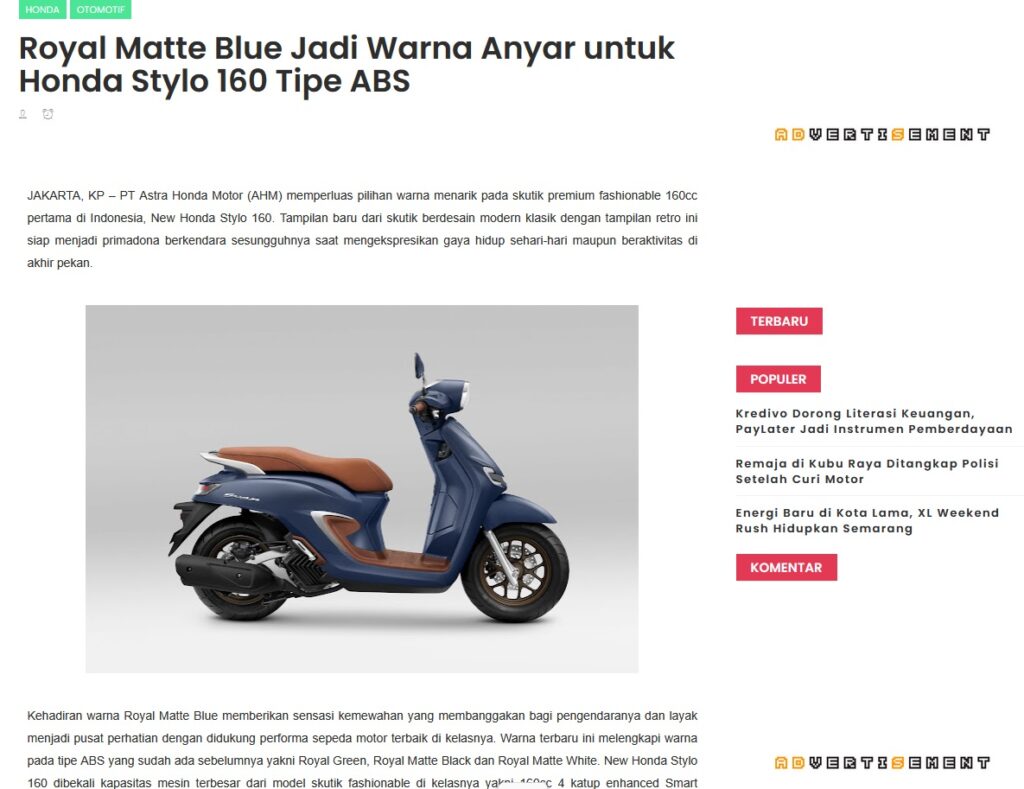 Royal Matte Blue Jadi Warna Anyar untuk Honda Stylo 160 Tipe ABS by Muhammad Arif 7 September 2025 in Silahkan kunjungi https://www.kapuaspost.web.id/2025/09/royal-matte-blue-jadi-warna-anyar-untuk.html. Tags: astra Astra Motor kalbar Astra Motor Pontianak astramotor honda kalbar pontianak sepeda motor You Might Like Regional Public Launching New ADV160 The SUV Pride Grand Launching New PCX 160 Truly Exceptional! Tetap hati-hati ya bro sist berkendara saat hujan.