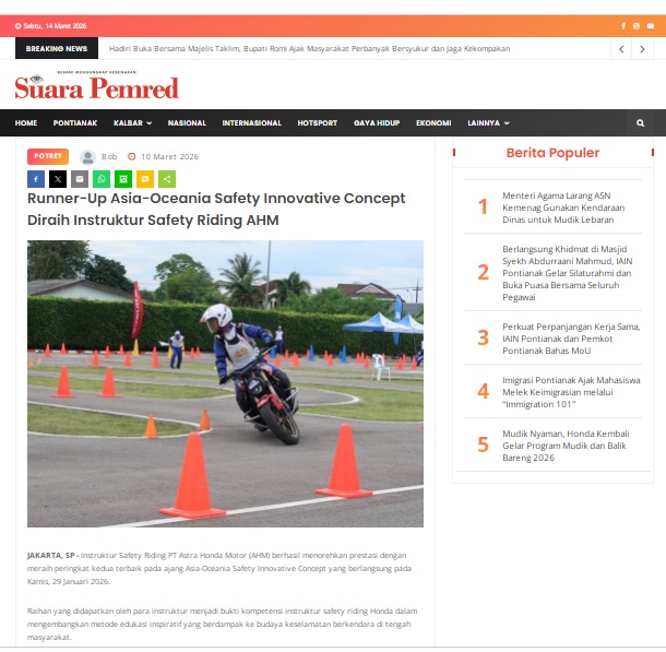 Runner-Up Asia-Oceania Safety Innovative Concept Diraih Instruktur Safety Riding AHM by masmul 10 Maret 2026 in Silahkan kunjungi https://www.suarapemredkalbar.com/read/potret/10032026/runner-up-asia-oceania-safety-innovative-concept-diraih-instruktur-safety-riding-ahm. You Might Like Regional Public Launching New ADV160 The SUV Pride Grand Launching New PCX 160 Truly Exceptional! Tetap hati-hati ya bro sist berkendara saat hujan.