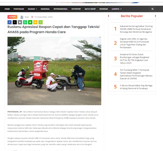 Ruslanu Apresiasi Respon Cepat dan Tanggap Teknisi AHASS pada Program Honda Care by masmul 10 September 2025 in Silahkan kunjungi https://www.suarapemredkalbar.com/read/potret/10092025/ruslanu-apresiasi-respon-cepat-dan-tanggap-teknisi-ahass-pada-program-honda-care. You Might Like Regional Public Launching New ADV160 The SUV Pride Grand Launching New PCX 160 Truly Exceptional! Tetap hati-hati ya bro sist berkendara saat hujan.