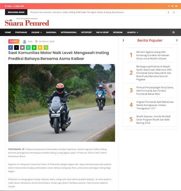 Saat Komunitas Motor Naik Level: Mengasah Insting Prediksi Bahaya Bersama Asmo Kalbar by masmul 4 Maret 2026 in Silahkan kunjungi https://www.suarapemredkalbar.com/read/potret/04032026/saat-komunitas-motor-naik-level-mengasah-insting-prediksi-bahaya-bersama-asmo-kalbar. You Might Like Regional Public Launching New ADV160 The SUV Pride Grand Launching New PCX 160 Truly Exceptional! Tetap hati-hati ya bro sist berkendara saat hujan.