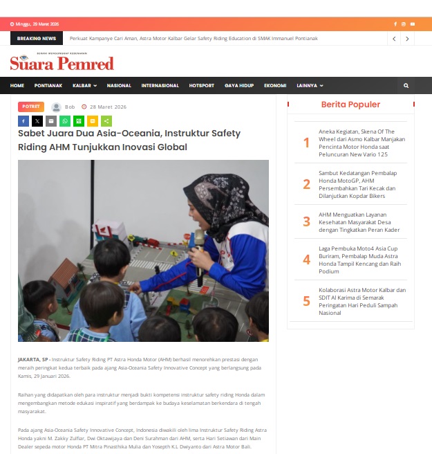 Sabet Juara Dua Asia-Oceania, Instruktur Safety Riding AHM Tunjukkan Inovasi Global by masmul 28 Maret 2026 in Silahkan kunjungi https://www.suarapemredkalbar.com/read/potret/28032026/sabet-juara-dua-asia-oceania-instruktur-safety-riding-ahm-tunjukkan-inovasi-global. You Might Like Regional Public Launching New ADV160 The SUV Pride Grand Launching New PCX 160 Truly Exceptional! Tetap hati-hati ya bro sist berkendara saat hujan.