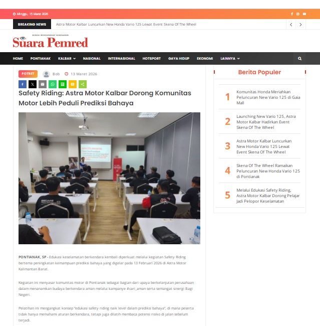 Safety Riding: Astra Motor Kalbar Dorong Komunitas Motor Lebih Peduli Prediksi Bahaya by masmul 13 Maret 2026 in Silahkan kunjungi https://www.suarapemredkalbar.com/read/potret/13032026/safety-riding-astra-motor-kalbar-dorong-komunitas-motor-lebih-peduli-prediksi-bahaya. You Might Like Regional Public Launching New ADV160 The SUV Pride Grand Launching New PCX 160 Truly Exceptional! Tetap hati-hati ya bro sist berkendara saat hujan.