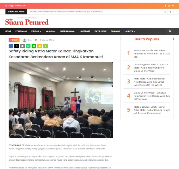 Safety Riding Astra Motor Kalbar: Tingkatkan Kesadaran Berkendara Aman di SMA K Immanuel by masmul 11 Maret 2026 in Silahkan kunjungi https://www.suarapemredkalbar.com/read/potret/11032026/safety-riding-astra-motor-kalbar-tingkatkan-kesadaran-berkendara-aman-di-sma-k-immanuel. You Might Like Regional Public Launching New ADV160 The SUV Pride Grand Launching New PCX 160 Truly Exceptional! Tetap hati-hati ya bro sist berkendara saat hujan.