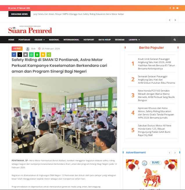 Safety Riding di SMAN 12 Pontianak, Astra Motor Perkuat Kampanye Keselamatan Berkendara cari aman dan Program Sinergi Bagi Negeri by masmul 25 Februari 2026 in Silahkan kunjungi https://www.suarapemredkalbar.com/read/potret/25022026/safety-riding-di-sman-12-pontianak-astra-motor-perkuat-kampanye-keselamatan-berkendara-cari-aman-dan-program-sinergi-bagi-negeri-1. You Might Like Regional Public Launching New ADV160 The SUV Pride Grand Launching New PCX 160 Truly Exceptional! Tetap hati-hati ya bro sist berkendara saat hujan.