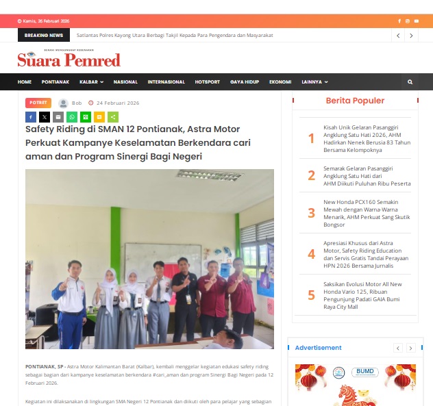 Safety Riding di SMAN 12 Pontianak, Astra Motor Perkuat Kampanye Keselamatan Berkendara cari aman dan Program Sinergi Bagi Negeri by masmul 24 Februari 2026 in Silahkan kunjungi https://www.suarapemredkalbar.com/read/potret/24022026/safety-riding-di-sman-12-pontianak-astra-motor-perkuat-kampanye-keselamatan-berkendara-cari-aman-dan-program-sinergi-bagi-negeri. You Might Like Regional Public Launching New ADV160 The SUV Pride Grand Launching New PCX 160 Truly Exceptional! Tetap hati-hati ya bro sist berkendara saat hujan.