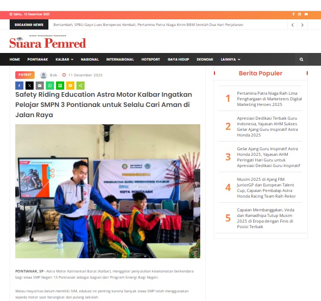 Safety Riding Education Astra Motor Kalbar Ingatkan Pelajar SMPN 3 Pontianak untuk Selalu Cari Aman di Jalan Raya by masmul 11 Desember 2025 in Silahkan kunjungi https://www.suarapemredkalbar.com/read/potret/11122025/safety-riding-education-astra-motor-kalbar-ingatkan-pelajar-smpn-3-pontianak-untuk-selalu-cari-aman-di-jalan-raya. You Might Like Regional Public Launching New ADV160 The SUV Pride Grand Launching New PCX 160 Truly Exceptional! Tetap hati-hati ya bro sist berkendara saat hujan.