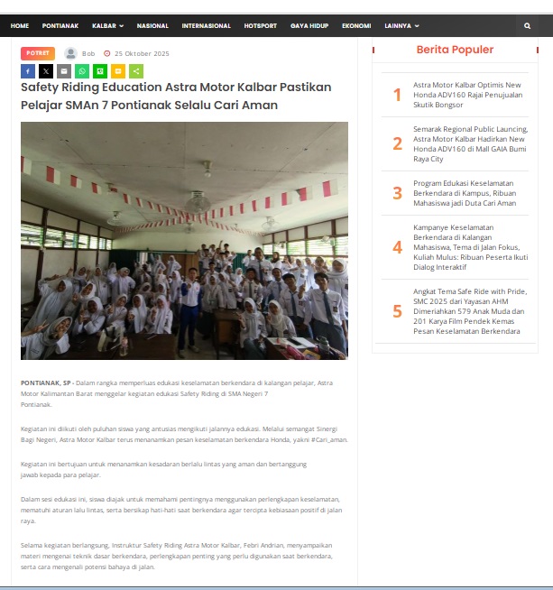 Safety Riding Education Astra Motor Kalbar Pastikan Pelajar SMAn 7 Pontianak Selalu Cari Aman by masmul 25 Oktober 2025 in Silahkan kunjungi https://www.suarapemredkalbar.com/read/potret/25102025/safety-riding-education-astra-motor-kalbar-pastikan-pelajar-sman-7-pontianak-selalu-cari-aman. You Might Like Regional Public Launching New ADV160 The SUV Pride Grand Launching New PCX 160 Truly Exceptional! Tetap hati-hati ya bro sist berkendara saat hujan.