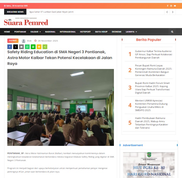 Safety Riding Education di SMA Negeri 3 Pontianak, Astra Motor Kalbar Tekan Potensi Kecelakaan di Jalan Raya by masmul 28 November 2025 in Silahkan kunjungi https://www.suarapemredkalbar.com/read/potret/28112025/safety-riding-education-di-sma-negeri-3-pontianak-astra-motor-kalbar-tekan-potensi-kecelakaan-di-jalan-raya. You Might Like Regional Public Launching New ADV160 The SUV Pride Grand Launching New PCX 160 Truly Exceptional! Tetap hati-hati ya bro sist berkendara saat hujan.