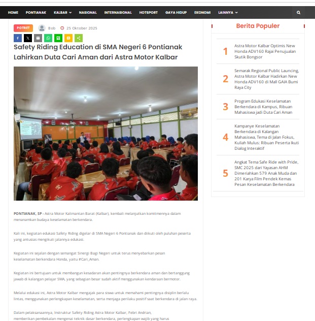 Safety Riding Education di SMA Negeri 6 Pontianak Lahirkan Duta Cari Aman dari Astra Motor Kalbar by masmul 25 Oktober 2025 in Silahkan kunjungi https://www.suarapemredkalbar.com/read/potret/25102025/safety-riding-education-di-sma-negeri-6-pontianak-lahirkan-duta-cari-aman-dari-astra-motor-kalbar. You Might Like Regional Public Launching New ADV160 The SUV Pride Grand Launching New PCX 160 Truly Exceptional! Tetap hati-hati ya bro sist berkendara saat hujan.