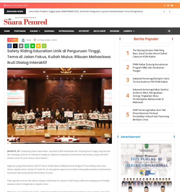 Safety Riding Education Unik di Perguruan Tinggi, Tema di Jalan Fokus, Kuliah Mulus: Ribuan Mahasiswa Ikuti Dialog Interaktif by masmul 22 November 2025 in Silahkan kunjungi https://www.suarapemredkalbar.com/read/potret/22112025/safety-riding-education-unik-di-perguruan-tinggi-tema-di-jalan-fokus-kuliah-mulus-ribuan-mahasiswa-ikuti-dialog-interaktif. You Might Like Regional Public Launching New ADV160 The SUV Pride Grand Launching New PCX 160 Truly Exceptional! Tetap hati-hati ya bro sist berkendara saat hujan.