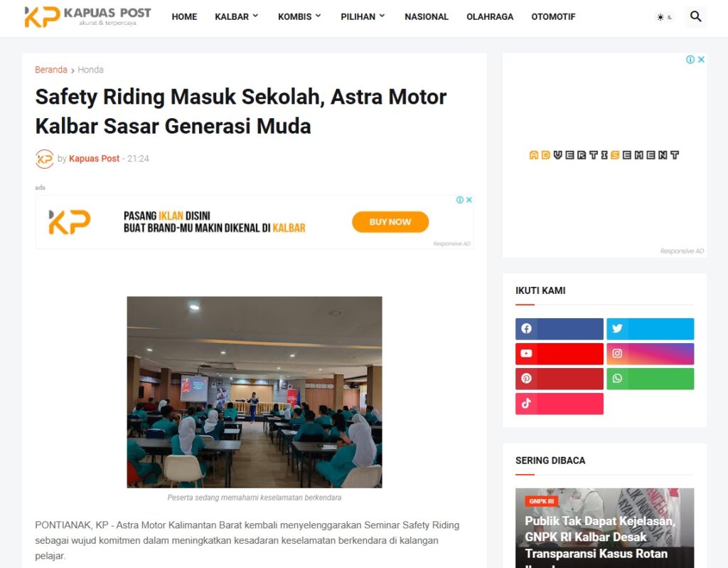 Safety Riding Masuk Sekolah, Astra Motor Kalbar Sasar Generasi Muda by Muhammad Arif 29 Januari 2026 in Silahkan kunjungi https://www.kapuaspost.web.id/2026/01/safety-riding-masuk-sekolah-astra-motor.html. Tags: astra Astra Motor kalbar Astra Motor Pontianak astramotor honda kalbar pontianak sepeda motor You Might Like Regional Public Launching New ADV160 The SUV Pride Grand Launching New PCX 160 Truly Exceptional! Tetap hati-hati ya bro sist berkendara saat hujan.