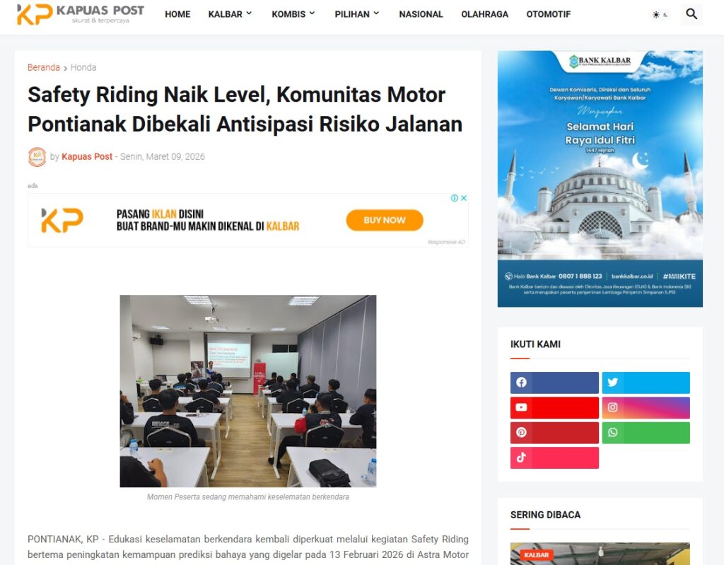 Safety Riding Naik Level, Komunitas Motor Pontianak Dibekali Antisipasi Risiko Jalanan by Muhammad Arif 9 Maret 2026 in Silahkan kunjungi https://www.kapuaspost.web.id/2026/03/safety-riding-naik-level-komunitas.html. Tags: astra Astra Motor kalbar Astra Motor Pontianak astramotor honda kalbar pontianak sepeda motor You Might Like Regional Public Launching New ADV160 The SUV Pride Grand Launching New PCX 160 Truly Exceptional! Tetap hati-hati ya bro sist berkendara saat hujan.